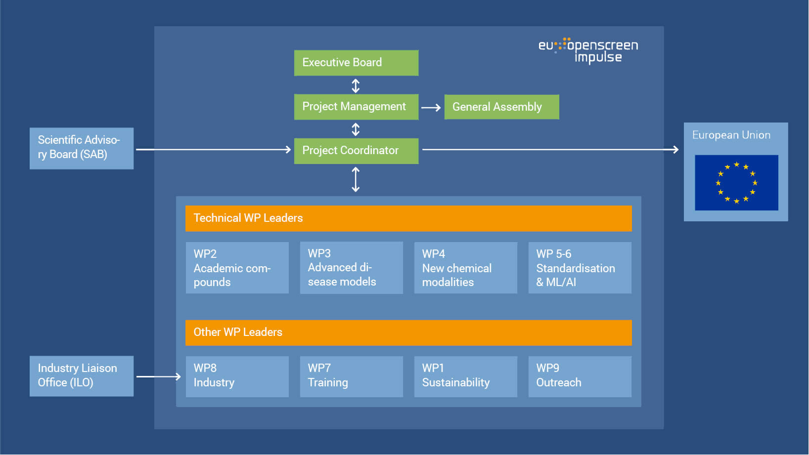 These governing bodies liaise with the IMPULSE Project Coordinator Bahne Stechmann and the Project Management Team (PMT), situated at the EU-OPENSCREEN central office. Decisions made by the governing bodies are transmitted via the Project Coordinator and PMT to the leaders of all work packages. The Project Coordinator also liaises between the project and the European Commission.