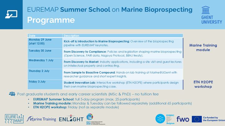 Registrations are now open for the EUREMAP Summer School on Marine Bioprospecting. Organised by Ghent University, this school will be taking place in Ostend, Belgium from 29 June to 3 July 2026.